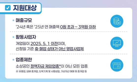 - 소상공인 정책자금 제외 업종이 아닌 모든 업종(유흥업, 담배중개업, 도박기계 및 사행성업, 가상자산 매매 및 중개업 등)