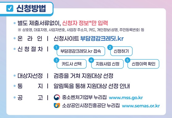 경영비용 부담을 줄일 수 있는 절호의 기회! 선착순 예산 소진 방식이므로 서둘러 신청하시기 바랍니다.